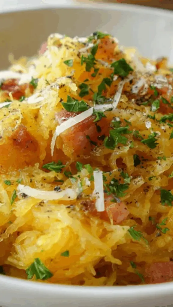 🍗🎃 Craving comfort without the carbs? This Creamy Chicken Spaghetti Squash Carbonara is your new low-carb, gluten-free favorite! Tender roasted squash strands replace pasta, paired with juicy chicken and a rich, garlicky carbonara sauce. 🧄🧀 It’s light, creamy, and loaded with flavor—perfect for cozy nights or guilt-free seconds. Who says healthy can’t be indulgent? This dish delivers all the creamy goodness with none of the carb crash! 💛✨