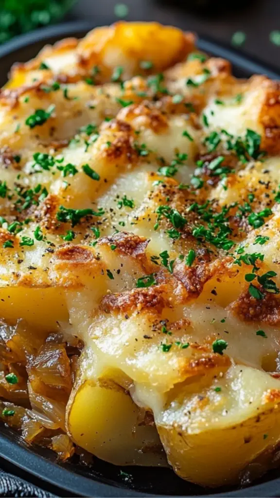 What makes this recipe stand out is its use of dry onion soup mix and beef broth, which infuse the potatoes with a deep, rich taste. The melted Swiss and mozzarella cheeses create a beautifully gooey topping that ties everything together. Even better, this dish is incredibly versatile—you can enjoy it as a main course, a side dish, or even customize it with extra ingredients to suit your preferences.