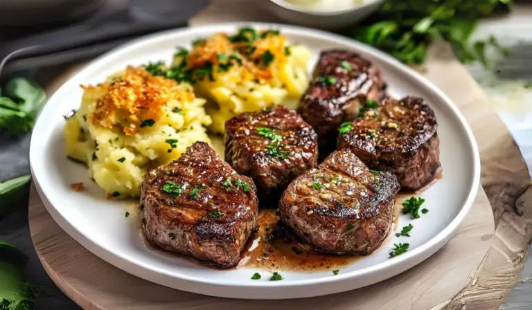 Tender, juicy steak bites cooked in a garlic butter sauce alongside golden, cheesy smashed potatoes create a dish that’s indulgent yet easy to prepare.