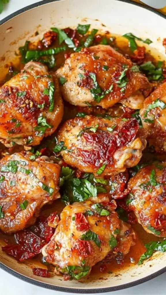 Skillet Sun-Dried Tomato Chicken Thighs is the perfect beginner-friendly recipe that delivers rich flavors without complicated techniques. The combination of juicy chicken, creamy sun-dried tomato sauce, and fresh greens makes it a well-balanced, satisfying dish.
