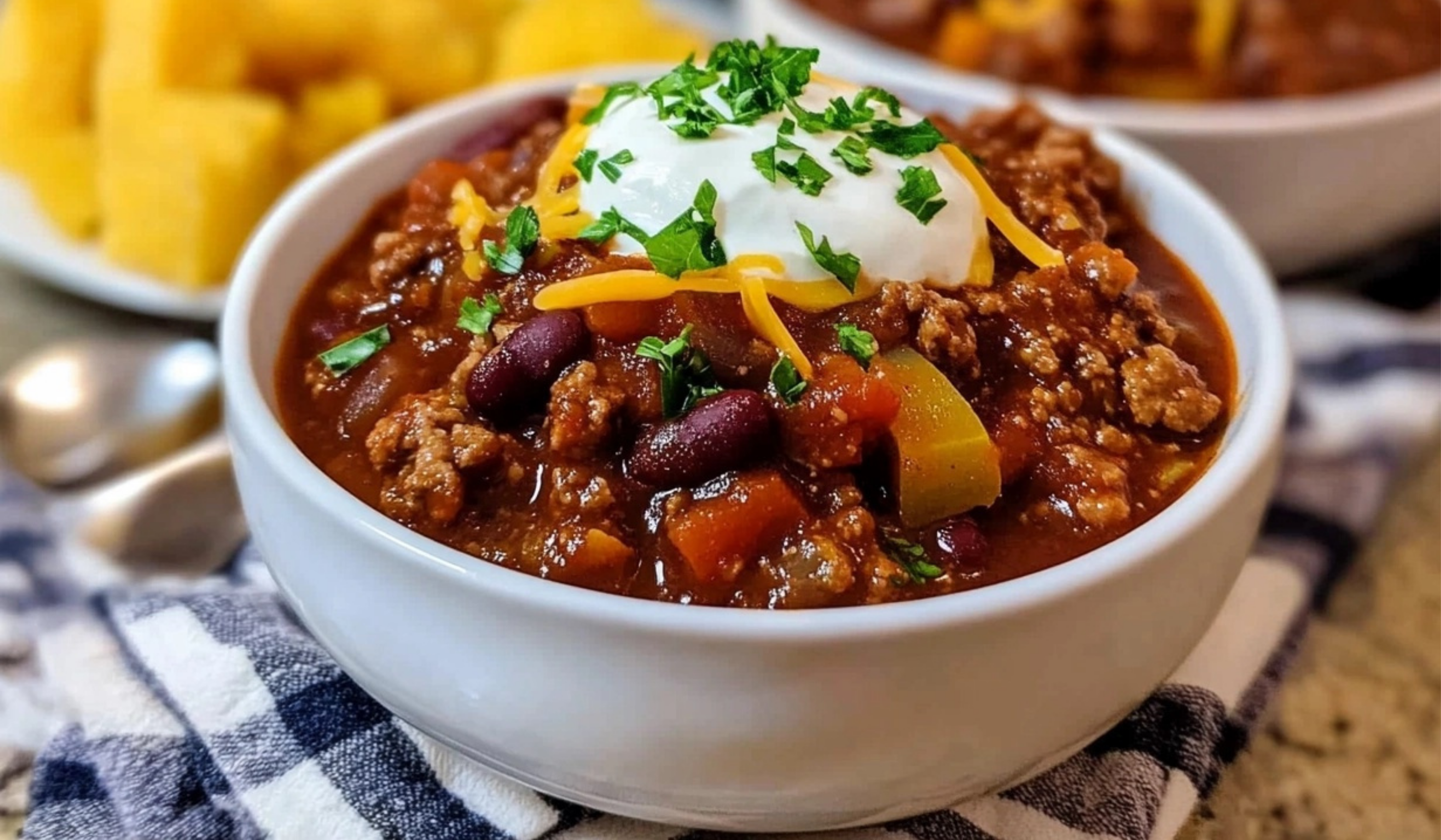 The chili itself is thick and hearty, with chunks of beef and soft beans floating in a slightly tangy, smoky broth. The slight sweetness from the cocoa powder and sugar balances out the heat from the chili powder, making each bite a perfect harmony of flavors. The toppings, such as the cool, creamy sour cream and the melty cheese, provide a refreshing contrast to the spicy chili, making each spoonful even more satisfying.
