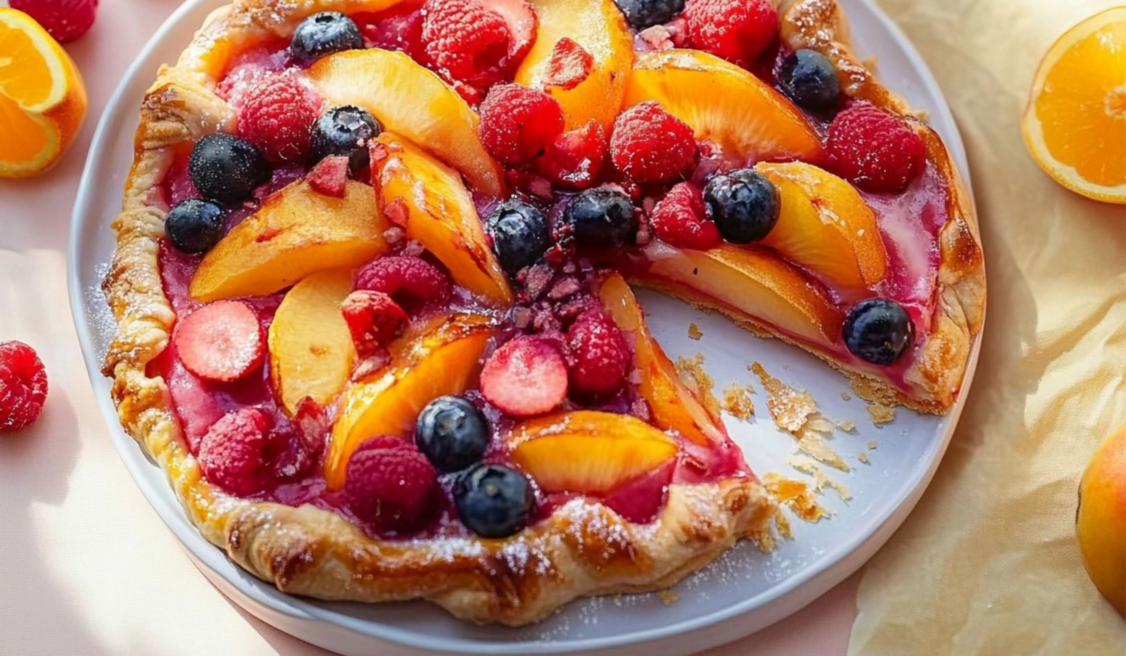 Visually, the galette is a work of art. Its rustic charm lies in the vibrant fruit center framed by the golden, pleated crust. The colors of the fruits—orange, yellow, deep purple, and blue—create a mosaic that’s almost too beautiful to eat.