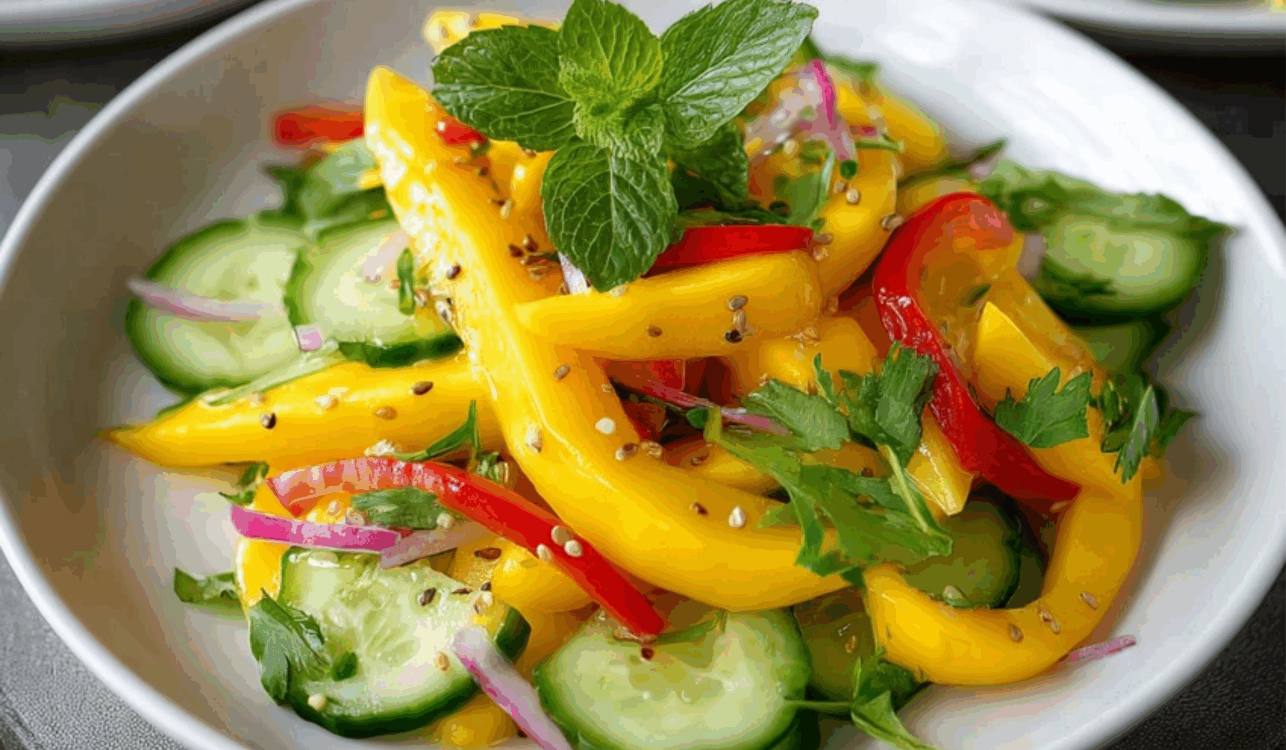 - In a large bowl, combine the julienned mango, sliced vegetables, and fresh herbs.