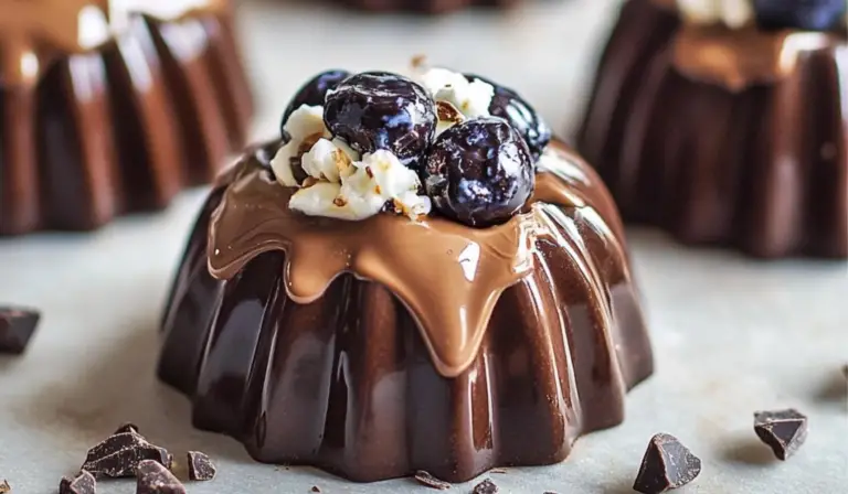 When you’re ready to serve, carefully remove the mini bundt cakes from their molds. The no-bake nature of these cakes means they remain delicate, so handle them with care. For an elegant finish, drizzle the cakes with extra melted dark chocolate and top them with fresh blueberries. The blueberries add a pop of color and a burst of tartness that balances the richness of the chocolate. Serve these cakes chilled to enjoy their creamy texture and intense flavor.